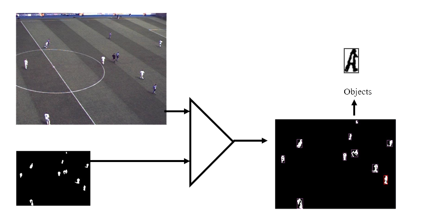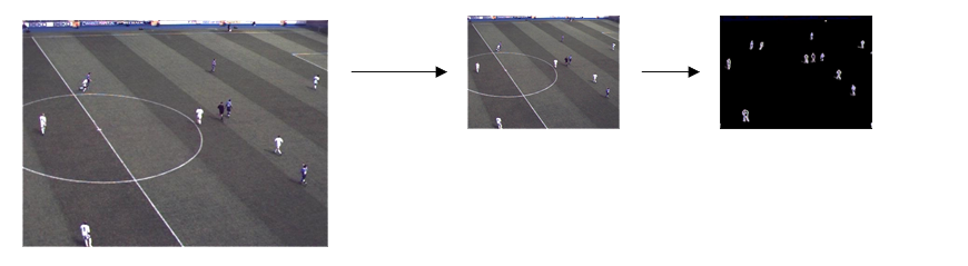 First stage is looking-up for small objects. That task is performing by convolution with most probable mask (player):