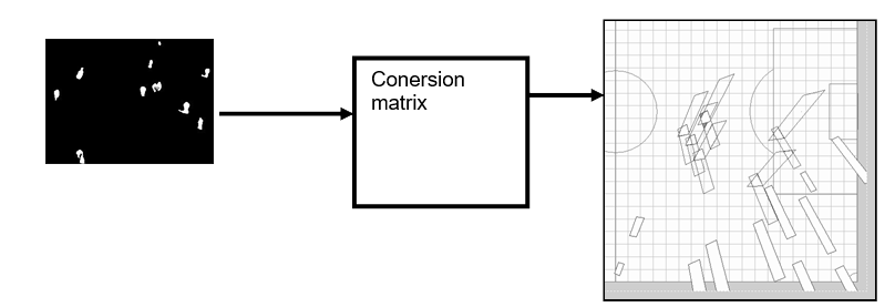The main part of the module is the geometry conversion thread, which collect and transforms data from cameras and transform data to the field physical coordinates. The process is simplistic shown below: