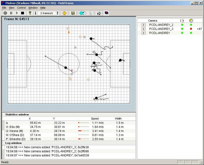 The matching thread - joins data from different cameras with same time-mark in one data block and looks matching between positions of objects taken from different cameras, the result of the processing is physical coordinates of the objects on the field: