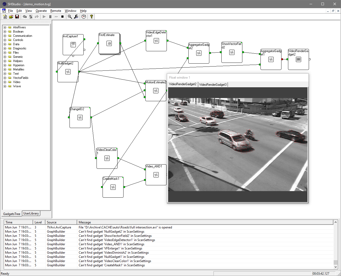 The Stream Handler SDK distributive provides a visual tool SHStudio for creation and testing the processing graphs. It allows interactively build processing graph and estimate any intermediate results of processing. The creation of the processing graph can be made in vivo, i.e., when graph is running and data steams through the graph. It is possible to insert new gadgets, connect them or disconnect, inspect data passed through the graph in any point of the graph.